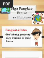Ang tinatawag na mga pangkat-etniko sa Pilipinas ay maaaring ipakahulugan na isang pag-uuri o sarilinang pagkakakilanlan ng mga Pilipino batay sa kanilang lipi wika relihiyon o kasaysayanMula hilaga hanggang timog ang pinakamarami sa mga pangkat na ito ay ang mga Ilocano Pangasinense Tagalog Kapampangan Bicolano at BisayaPinaniniwalaaang kabilang. Among pangkat -etniko ang makikita sa Cotabato sa Mindanao A. Casacop 6- Saint Lorenzo Ruiz.